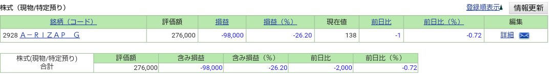 2020-12-09 ポートフォリオ 営業日:2020/12/9 ポートフォリオ 8日のNY株式市場は上昇。S&P500とNASDAQは最高値を更新しました。 本日の東京株式市場は1%を超える上昇。 今晩のNY株式市場は上昇でしょうか。 SBI証券 RIZAPは微減でした。 投資信託は、全体的には上昇。含み+90万も近いです。このまま増えるのでしょうか。 楽天証券 こちらも微増し、含み益が率・額ともに過去最高を更新です。 ウェルスナビ THEO ウェルスナビは、+19%台に下落しました。THEOは、+2万台へ下落しました。
